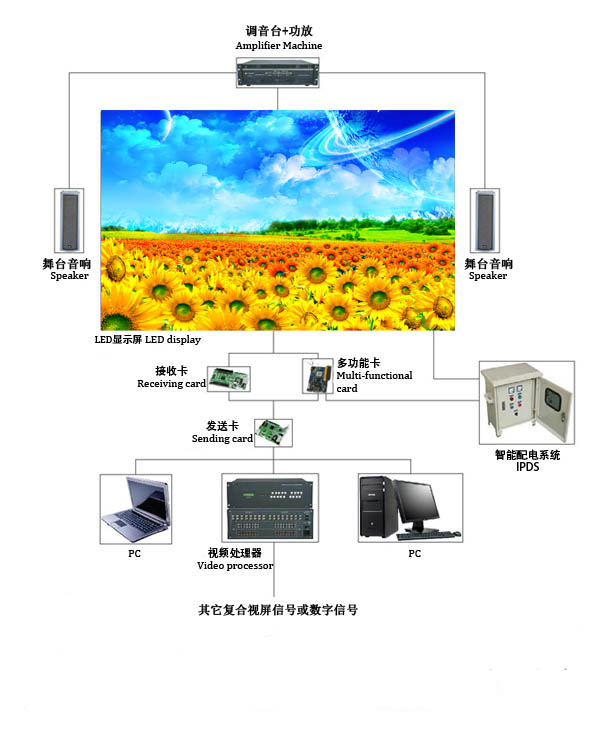 舞臺(tái)背景的要求隨著大屏幕LED顯示系統(tǒng)技術(shù)的提高,已越來(lái)越被編導(dǎo)們看好并運(yùn)用。大場(chǎng)景大畫面配合歌舞主體以達(dá)到渲染現(xiàn)場(chǎng)歡樂(lè)、熱烈的效果,使舞臺(tái)上下演員與觀眾融入一體,使觀眾身臨其境。、可將一個(gè)畫面切分為多個(gè)視頻畫面播出 、顯示屏可獨(dú)立、結(jié)合、任意組合使用播放相關(guān)大背景、大屏幕可根據(jù)演出需求分區(qū)顯示,并可實(shí)現(xiàn)圖文的迭加、背景畫面用視頻信號(hào)處理器播放或合成同一畫面顯示、可對(duì)人物特寫播放、可做文字滾動(dòng)播放、或插播播放、可水平推移視頻畫面屏風(fēng),也可上下升降成為文字、個(gè)性視頻畫面、亮化、美化舞臺(tái)背景及舞臺(tái)地面、通過(guò)軟件設(shè)計(jì)及系統(tǒng)控制來(lái)滿足視覺上的效果。 佳惠科技以全新方案解決目前舞臺(tái)LED花樣顯示其繁瑣控制及完成更多的特效等難題,可以根據(jù)現(xiàn)場(chǎng)擺設(shè)的不規(guī)則LED點(diǎn)陣,可以根據(jù)現(xiàn)場(chǎng)顯示環(huán)境效果的需要,通過(guò)控制軟件配置,實(shí)現(xiàn)變換多樣的顯示效果。