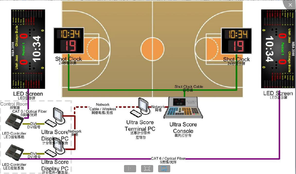 體育館兩邊安裝兩塊LED顯示屏,兩塊屏后的控制室內(nèi)分別設(shè)立控制電腦,負責大屏的控制和顯示,大屏通過LED數(shù)據(jù)和控制電腦相連。場館內(nèi)設(shè)立局域網(wǎng),兩臺LED顯示屏控制電腦都連入網(wǎng)絡(luò),同時比賽期間放于場邊的裁判操作電腦連入局域網(wǎng),該電腦與籃球打分控制器相連接,比賽時裁判只需要在場邊進行打分。兩塊大屏可同時顯示相同信息,也可以各自分別顯示不同的內(nèi)容。兩邊的籃球架上都安裝籃球24秒專用顯示屏,并用數(shù)據(jù)線連接到場邊的24秒控制臺上,比賽中可由專人負責進行比賽和24秒計時操作。24秒控制臺與場邊的裁判控制電腦可以使用數(shù)據(jù)線連接,則也可以使用軟件來控制24秒計時的顯示同時在場邊配置了一套籃球?qū)S玫姆敢?guī)顯示器(單面顯示),用于顯示賽隊犯規(guī)次數(shù)。 一套籃球?qū)S们驒?quán)控制器(單面顯示),指示當前控球權(quán)的一方。在單獨的一臺電腦上安裝籃球比賽用軟件,用于統(tǒng)計賽程中球員的賽場表現(xiàn)情況。比分直播系統(tǒng)通過與體育場館比賽計分系統(tǒng)、籃球技術(shù)統(tǒng)計軟件進行通訊,在采集多路現(xiàn)場視頻信號的同時,對信號進行本地化的快速編輯處理,實現(xiàn)現(xiàn)場實時比分疊加、球員信息顯等視頻播放要求。賽場的多媒體綜合信息發(fā)布系統(tǒng),與賽場計時記分系統(tǒng)聯(lián)動,用于在賽場周邊的屏幕上統(tǒng)一管理和發(fā)布球場相關(guān)的球賽得分信息、球員及裁判信息、廣告以及相關(guān)資訊、指引等。
