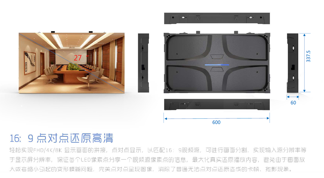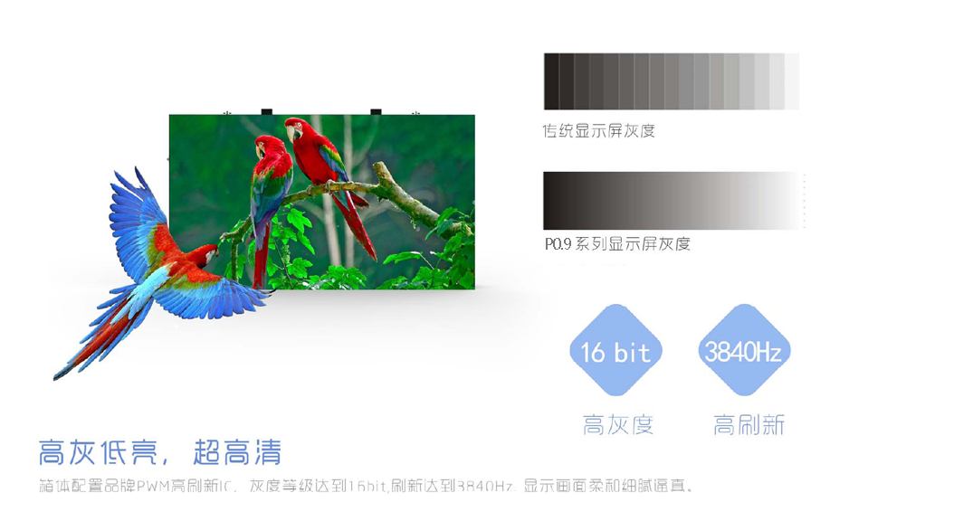 小間距P0.9LED顯示屏具有高刷新、高灰階、高亮度利用率、無殘影、低功耗、低EMI的特點(diǎn),室內(nèi)應(yīng)用不反光;其輕便超薄、精度高,占用運(yùn)輸及使用空間小、靜音且高效散熱。
