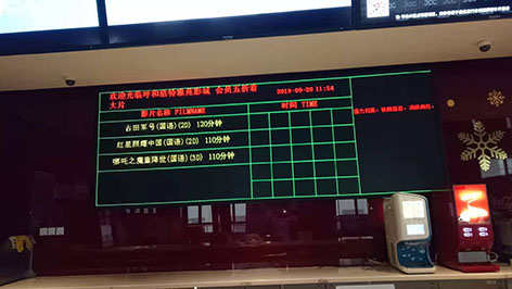 某影城的LED屏可以任意點陣顯示多語種字體,靈活地以多種方式進入和退出顯示,可以顯示各種表格,表內數(shù)據(jù)可通過專用的軟件人工輸入和更改,也可以利用編輯軟件將文字、圖片、表格進行組合,迭加顯示。可采集計算機內的當前時間,并適時分幅顯示,月、日、星期、時、分、秒等。
